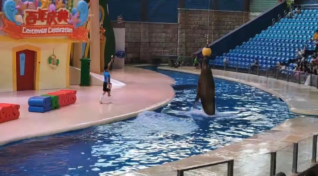 看著海豚在水中表演“水中芭蕾”,海豚與人類共同演譯的空中飛人,默契程度真是百分之一百的,體現(xiàn)人和動物的和諧共處。第一次覺得海豚是如此可愛的生物,真是萌化了一群大朋友的心。
