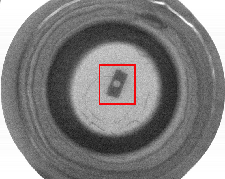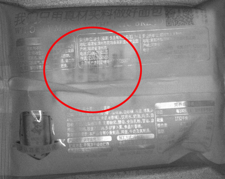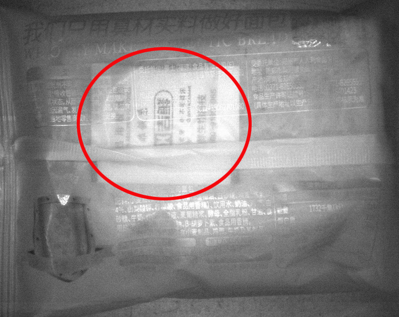 食品包裝常檢的有食品的完好、有無放防腐劑包等。下圖中近紅外照明對比不夠明顯,而短波紅外光源穿透性強照明對比大大提升。