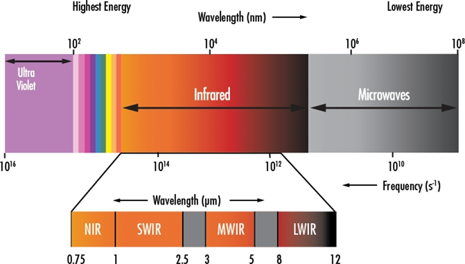短波紅外(SWIR)光一般指1000-1700nm波長范圍內的光線。由于普通工業相機硅傳感器的上限約為1000nm,因此SWIR成像需要能在SWIR范圍內工作的專用SWIR相機。砷化銦鎵(InGaAs)傳感器是在SWIR中使用的主要傳感器,使用該傳感器的SWIR相機可覆蓋典型的SWIR頻帶。