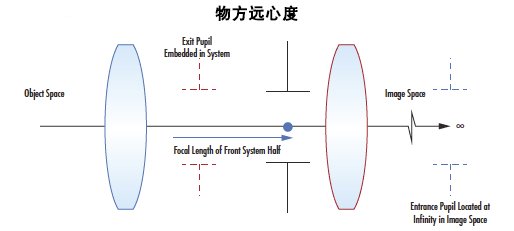 物方遠心度由入射光瞳在物方內的位置定義,像方遠心度可以由位于物方內無限遠處的出射光瞳定義。圖4中顯示了這一情形。