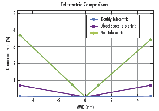 如圖所示,雙遠心鏡頭是群組中最準確的鏡頭,工作距離偏移4mm期間的誤差不到0.2%。雙遠心鏡頭應該用于需要最高準確性和精度的應用中。