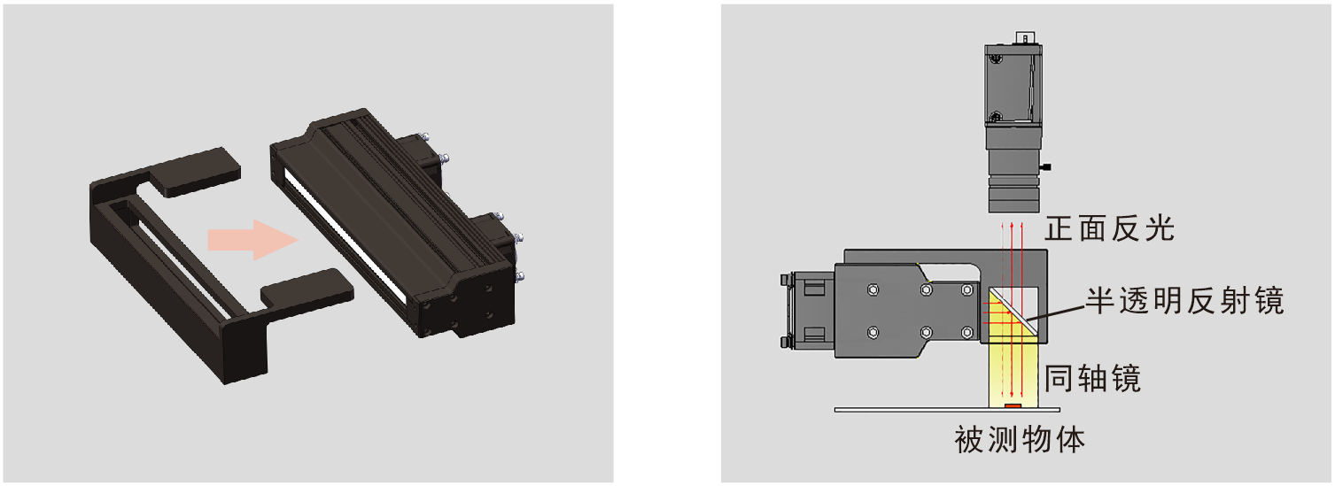 可結(jié)合同軸罩變成同軸線光源(4CONL系列),通過與同軸罩結(jié)合,通過與相機(jī)鏡頭同軸照射,使光線擴(kuò)散,對(duì)比度更清晰。