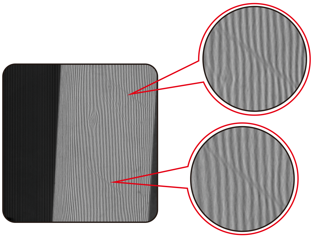 說明:對于光滑表面的凹凸點,通過判斷條紋的彎曲很容易找出缺陷位置,放大缺陷。線陣檢測面積大,可根據樣品的大小選擇相對大的光源來滿足視野的,均勻性相對面陣更有優勢。