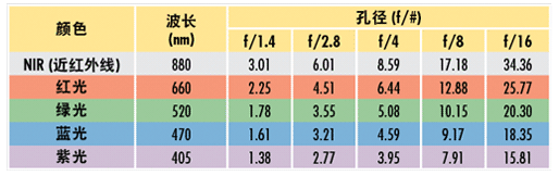 不同波長和鏡頭光圈下的理論艾里斑直徑光斑大小(μm)