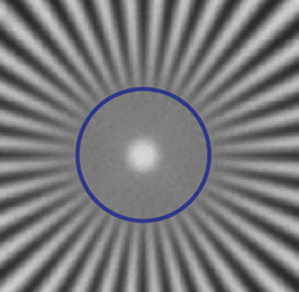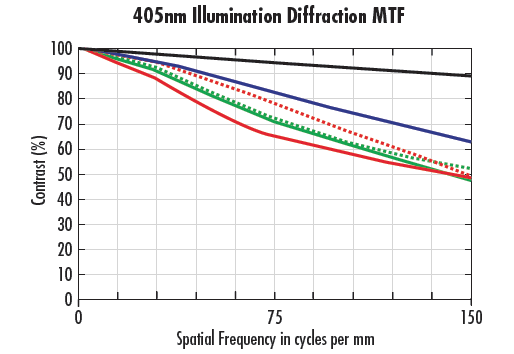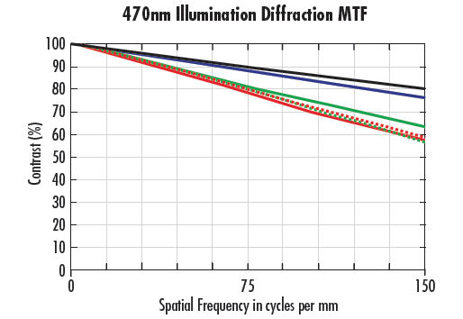 以顯著減少像差影響。這使衍射成為系統中的主要限制因素。藍色圓圈表示圖左圖中的極限分辨率。請注意,右圖的可解析細節得到了大幅提升(細節細膩度提高了約50%)。即使在頻率較低(線條更寬)時,右圖中使用470nm照明也能提供較高的對比度級別。