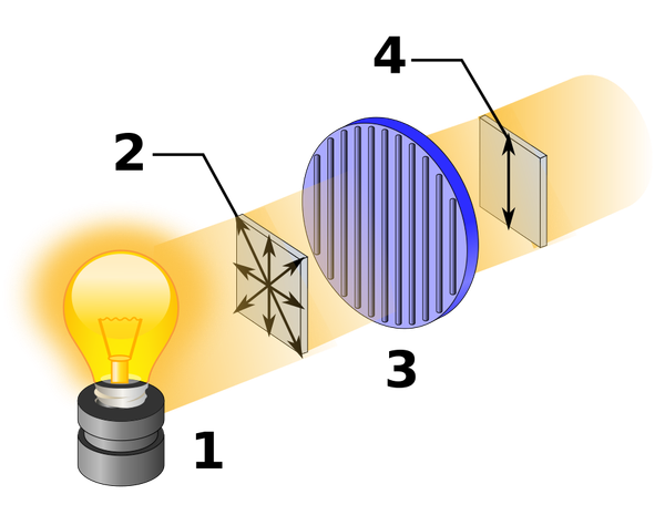 偏振鏡的作用就是就是消除或保留某個(gè)方向的偏振光。上圖說(shuō)明了偏振鏡的原理:1(白熾燈發(fā)出的)2(非偏振光)通過3(偏振鏡)的過濾變成了4(在一個(gè)方向上震蕩的偏振光)。