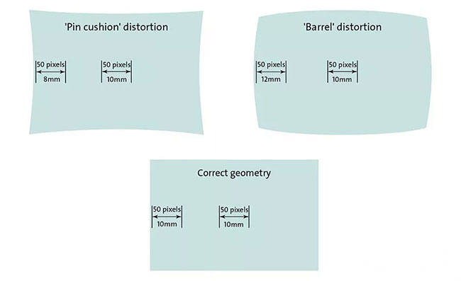 除了分辨率的變化外,所有透鏡也會(huì)受到一定的空間畸變。圖2顯示了如何以非線性方式拉伸或壓縮圖像,使整個(gè)傳感器的精確測量變得非常困難。雖然有一些軟件方法可以解決這個(gè)問題,但它們無法考慮物體的物理深度,因此最好選擇質(zhì)量好的低失真鏡頭,而不是試圖在軟件中糾正這些錯(cuò)誤。作為一般規(guī)則,較短焦距的鏡頭將具有比具有較長焦距的鏡頭更大的失真,因?yàn)楣鈴母蟮慕嵌日丈涞絺鞲衅鳌J褂酶鼜?fù)雜的鏡頭設(shè)計(jì),可以保持低失真,并且許多鏡頭制造商一直在努力研究他們的光學(xué)設(shè)計(jì),使他們能夠?qū)⒖臻g失真降低到0.1%的數(shù)量級。
