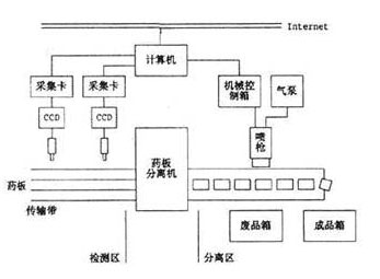 基于機器視覺技術的藥片包裝缺損檢測系統(tǒng)的硬件包括攝像系統(tǒng)和分離系統(tǒng)兩部分。