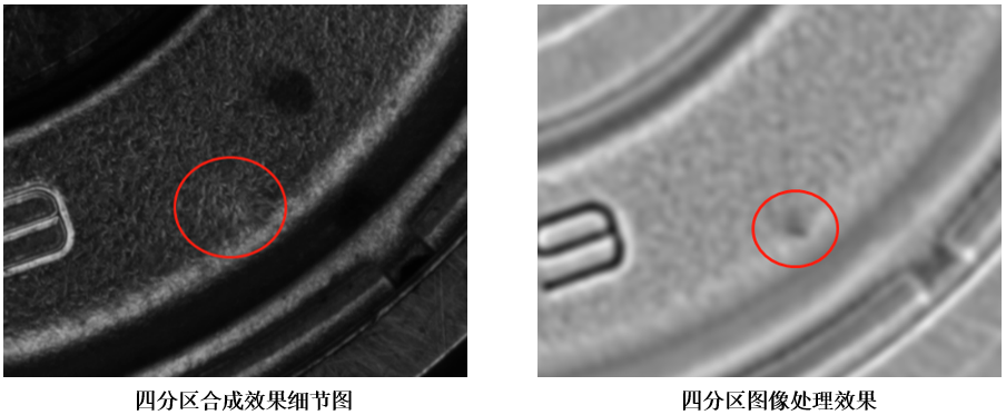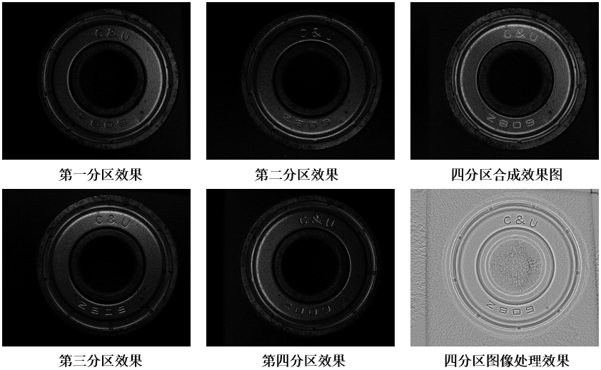 軸承上輕微的凹凸,單方向打光能突出一些微弱的效果,整體幾乎看不出效果,但是通過四分區分別成像,經過2.5D圖像處理分析能將微弱的凹凸呈現出來。