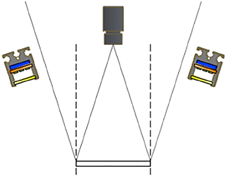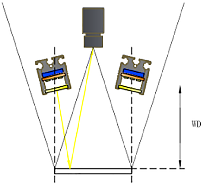 已知相機(jī)靶心與工作距離、鏡頭夾角、光源工作距離與視野后,就可以通過(guò)計(jì)算來(lái)確定光源的大小。同時(shí)還可以通過(guò)CAD等繪圖軟件按參數(shù)繪制出圖形,直觀(guān)的看出光源的光斑在哪個(gè)位置,確定是否選到大小合適的光源。如下圖所示: