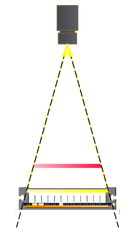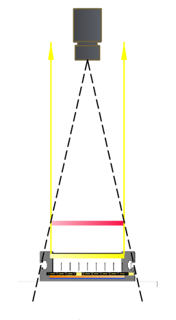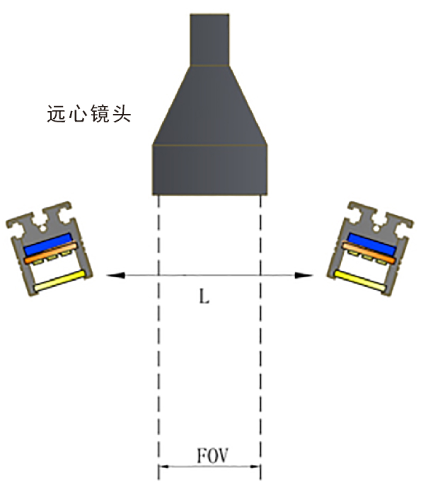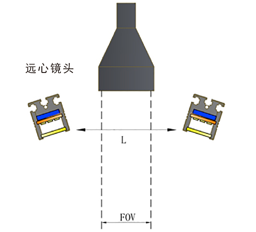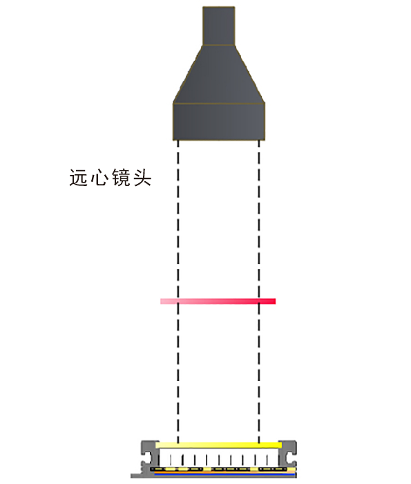 上面的兩種照射方式只說(shuō)到FA鏡頭,并且圖文也是以FA鏡頭舉例參考,那么還有一種鏡頭需要說(shuō)明,也就是常用的遠(yuǎn)心鏡頭,遠(yuǎn)心鏡頭基本為平行光路類(lèi)型,所以在配合遠(yuǎn)心鏡頭選擇光源大小時(shí),我們只需要比實(shí)際的視野略大一點(diǎn)即可。如下圖所示: