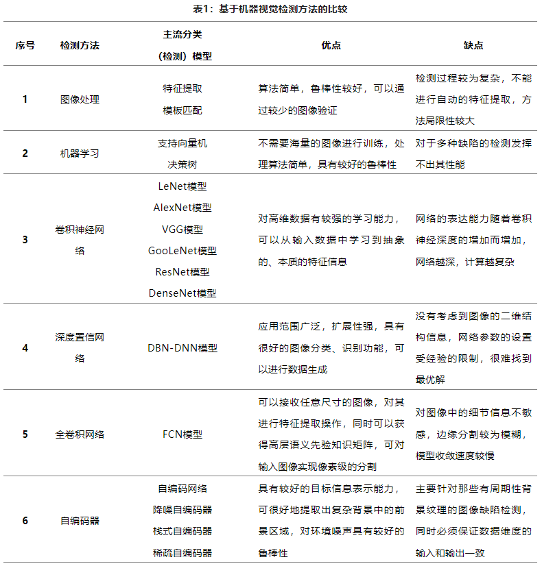 基于機(jī)器視覺的缺陷檢測(cè)方法的比較如表1所示,包括各種方法的主流分類(檢測(cè))模型、優(yōu)缺點(diǎn)對(duì)比。