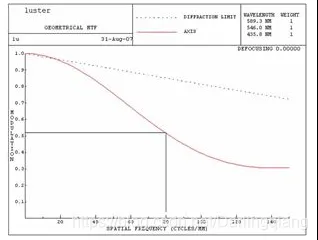 監控應用主要供人眼觀察,系統的MTF>0.22即可滿足人眼觀察的要求,因此對鏡頭來說,MTF>0.3即可滿足要求。