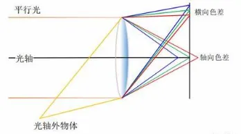 理論上色差在影像中央及邊緣都可以發生,不過由于邊緣的光程較長,因此色差也就特別明顯。由于短波長的折射率較高,因此紫色對色差也特別敏感。