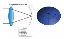 在一個平坦的影像平面上,影像的清晰度從中央向外發生變化,聚焦形成弧型,就叫場曲。場曲導致視場邊緣相對中心清晰度下降,也即MTF下降。