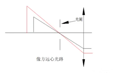 像方遠心光路的光路圖如下圖 。它是將孔徑光闌放置在物方焦平面上,像方主光線平行于光軸主光線的會聚中心位于像方無窮遠。這種鏡頭的特點是放大倍率與像距無關,可以消除像方調焦不準引入的測量誤差。