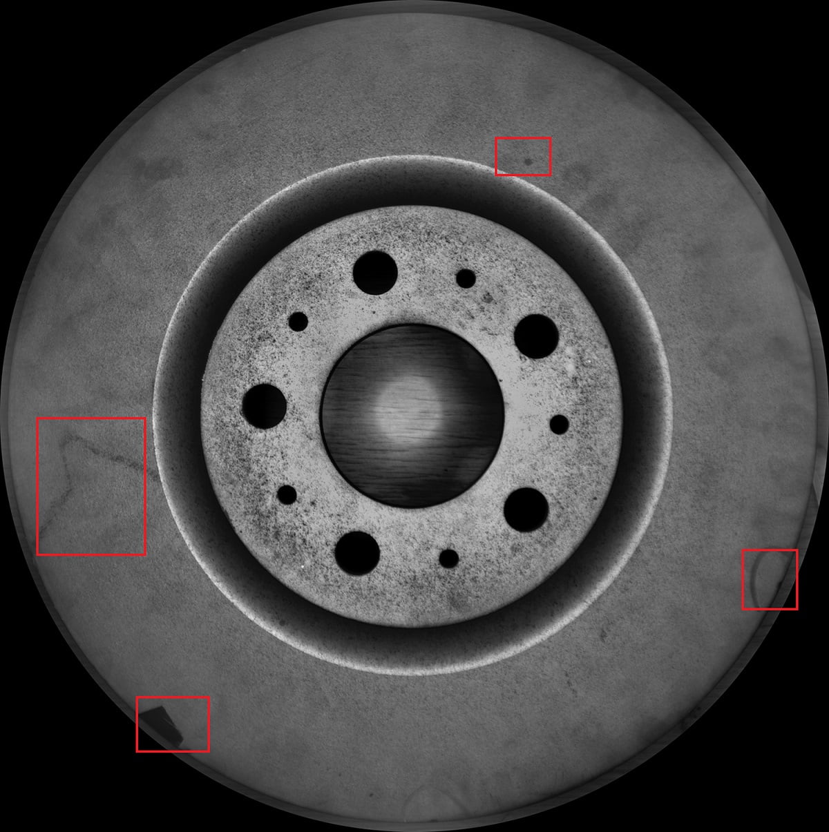 在汽車制造領域,剎車盤作為車輛制動系統的關鍵安全部件,其質量直接影響到駕駛員的行車安全。剎車盤生產過程中因不同生產工藝、生產環境、人工操作等因素,其成品常存在多種缺陷。表面缺陷主要有劃痕、砂眼、凹坑、生銹、磕碰、裂紋、風道異物等,這些缺陷會直接影響剎車盤的強度、硬度、應力、承受力等多項技術指標,從而縮短使用壽命,并帶來嚴重的安全隱患。因此,對剎車盤外觀缺陷進行精確檢測顯得尤為重要。
