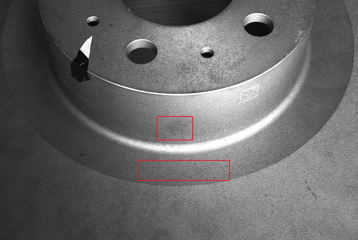 剎車盤正面尺寸大(直徑 30-40cm)且帶散熱筋(高低差 1-2cm),普通光源易產生陰影。采用“大景深短焦鏡頭結合開孔面光源”組合,鏡頭覆蓋高低差區域避免失焦,面光源均勻照射消除陰影。測試顯示,0.5mm 劃痕、0.3mm 砂眼呈明顯黑色,與淺灰色背景對比清晰,無漏判(如圖1所示)。