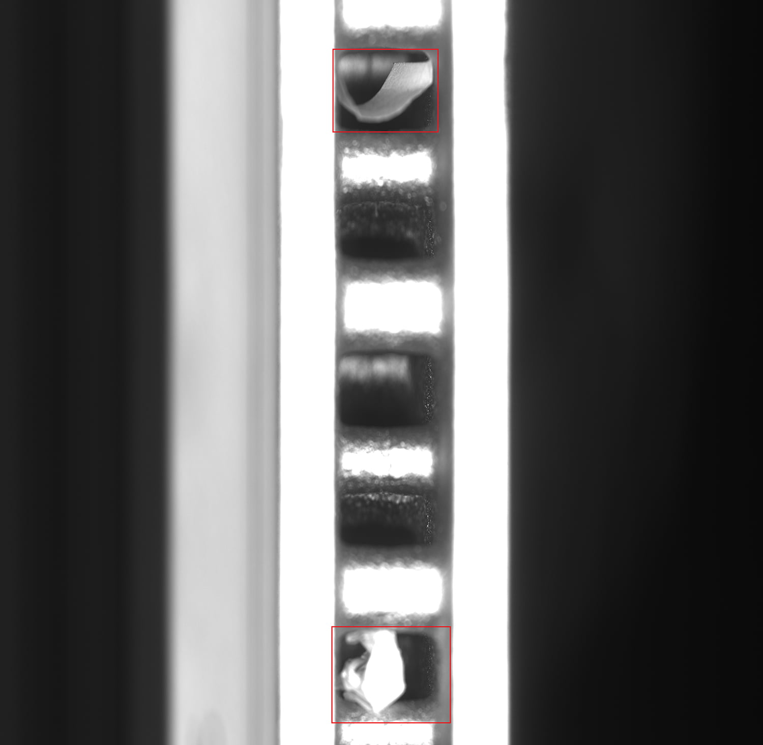 風道斜面空間狹窄(寬 1-2cm、深 3-5cm),普通光源難以深入。環繞式安裝多臺相機協同工作,共用一個光源照射,同步控制采集圖像。與風道內壁對比明顯,避免了光照不足導致的漏判(如圖3所示)。