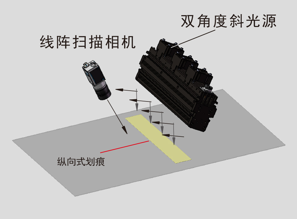 光源兩側斜向照射產品,顯現豎方向劃痕。