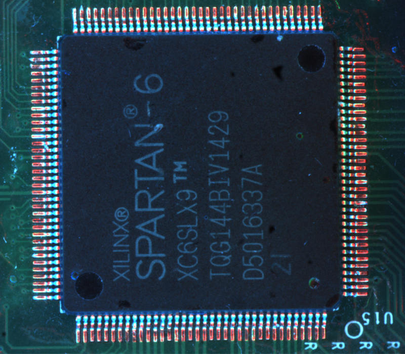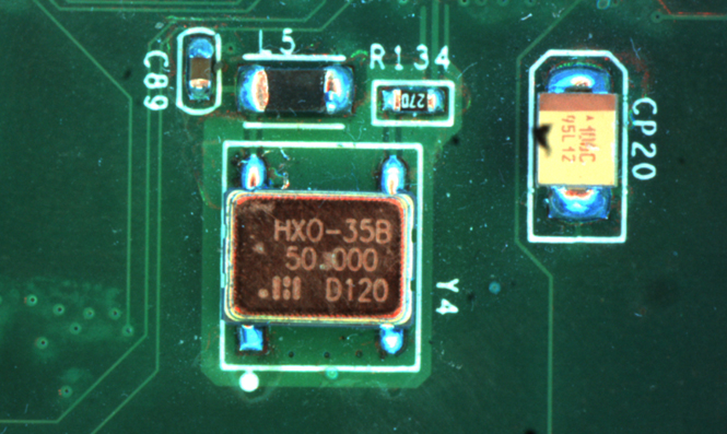 說明:PCB板上的焊錫缺陷,利用AOI光源RGB不同顏色的光打出不同的角度可以使,缺陷部分顏色特征突出。