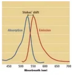 UV光可以有兩種不同的應用方式,一種是基于表面反射的方式,通過黑白相機或者紫外感光性好的彩色相機獲取物體表面的圖像;第二種,基于UV熒光的方式,物體表面被熒光照亮。有些產品,比如說油漆、塑料、油墨印刷和染料,它們添加有光學增白劑,這些熒光材料會吸收UV光然后重新發射出彌散的長波。吸收和發射的頻譜波段最大值位置的差異稱為斯托克斯位移(如下圖)。