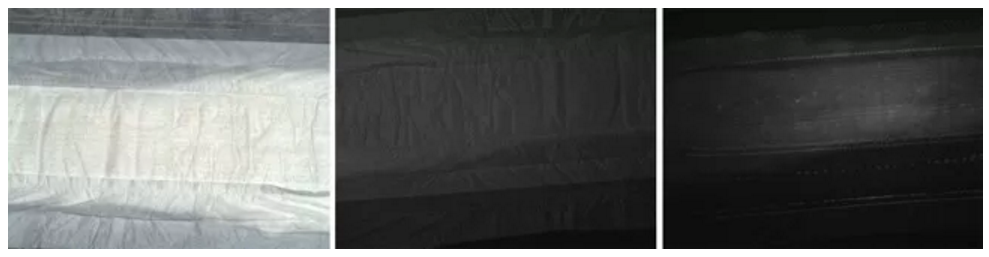 舉一個例子,生產紙尿褲的廠家希望檢測針腳是否完整。由于針線上有熒光,UV光可以用來將肉眼可見但不明顯的針線打出高的對比度。由于彩色圖像不能顯示針腳(圖左),用365nm的光源照射(圖中間)可以提供比395nm更高的對比度(圖右)。