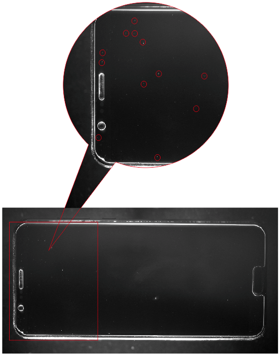 從效果圖上看迷你線光源3LINR220-W照射的灰塵顆粒要多,而且與實際面積大小相符,對應的檢測精度要高;條形光源4BR15030-W只能檢測大灰塵顆粒,與實際面積對比有所差異。具體效果如下圖所示: