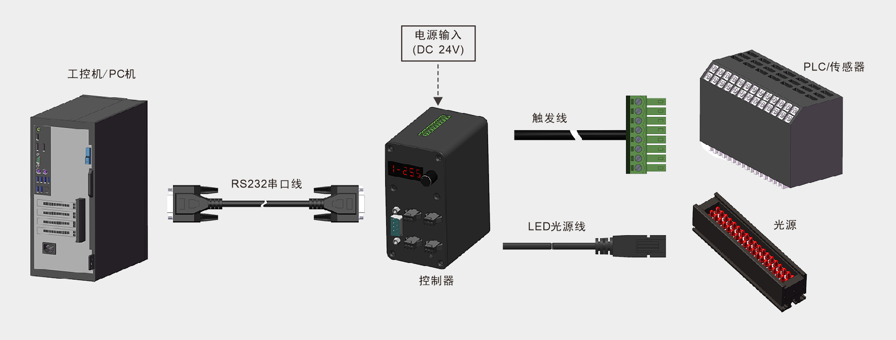 當外部連接觸發信號時,觸發“+”輸入高電平5-24V “-”接地時,光源滅。