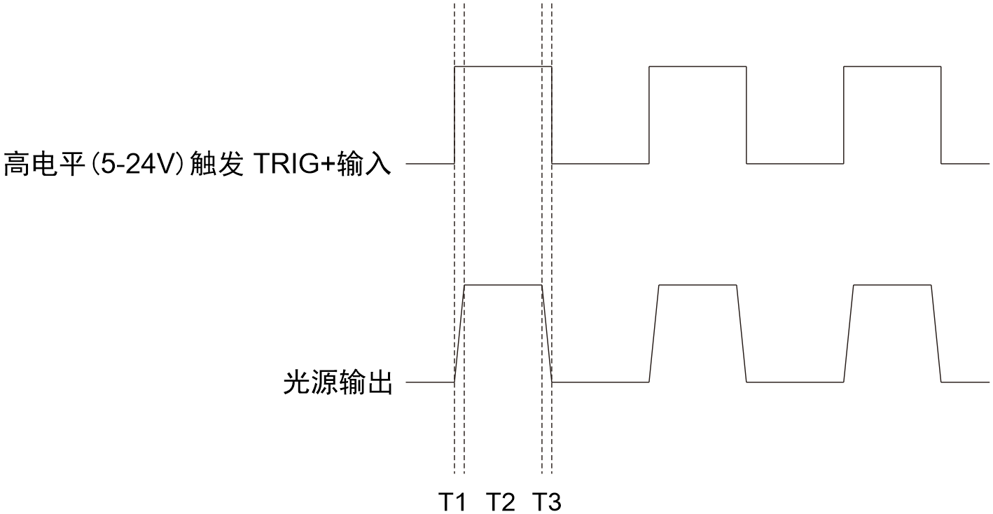 說明:T1觸發(fā)光源打開延時時間,T2光源被觸發(fā)后點亮時間,T3觸發(fā)光源關閉延時時間,T1≤10us,T3≤10us。