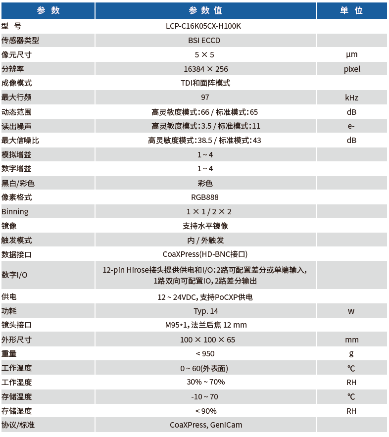 LCP-C16K05CX-H100K工業(yè)線陣相機,采用16384x256線TDI彩色ECCD Sensor,該Sensor同時兼具CCD TDI傳感器的高靈敏度、高信噪比以及CMOS TDI傳感器的高速度、低功耗的優(yōu)點,代表業(yè)內(nèi)最先進(jìn)水平。提供散熱片、風(fēng)扇等多種散熱方式,用以適應(yīng)更多的工業(yè)應(yīng)用場景。