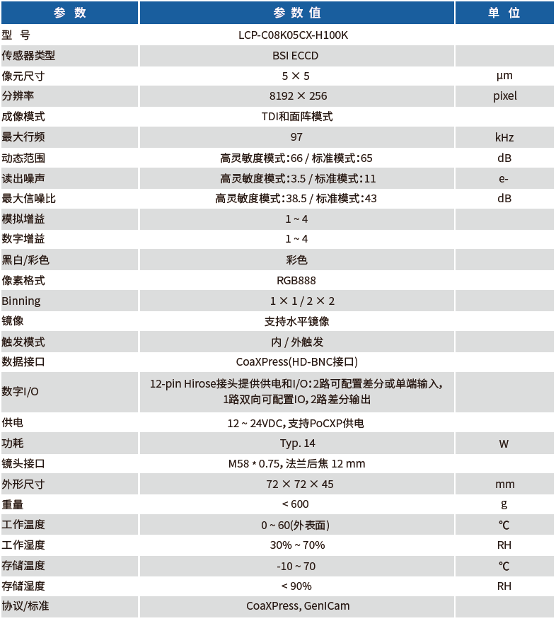 LCP-C08K05CX-H100K工業(yè)線陣相機(jī),采用8192x256線TDI彩色ECCD Sensor,該Sensor同時(shí)兼具CCD TDI傳感器的高靈敏度、高信噪比以及CMOS TDI傳感器的高速度、低功耗的優(yōu)點(diǎn),代表業(yè)內(nèi)最先進(jìn)水平。提供散熱片、風(fēng)扇等多種散熱方式,用以適應(yīng)更多的工業(yè)應(yīng)用場景。