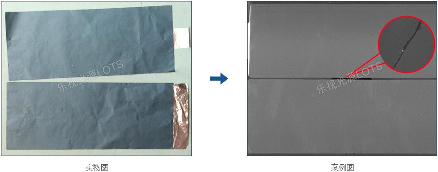 檢測黑色電池電芯膜表面凹凸點、劃傷、折皺等等,使用隧道線光圖像整體均勻,各種缺陷特征對比明顯。