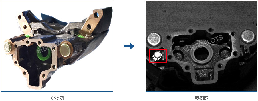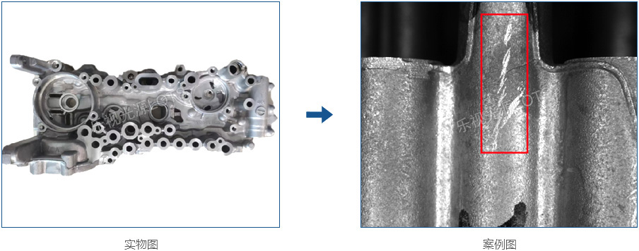 鑄造件表面為磨砂,有缺陷的位置是光滑的,沙眼會呈現黑色。因鑄造件都是大件,一次很難做到全檢,需機械手移動光源相機多次檢測,使用環形無影光源,可良好凸顯其缺陷。