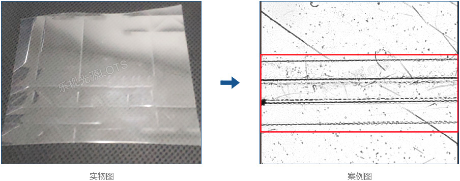 透明膜反光,正面打光會出現(xiàn)光斑,折痕不能充分體現(xiàn)出來,平行背光檢測折痕不明顯,用遠心平行光源配合遠心鏡頭,提高折痕的特征,折痕明顯呈現(xiàn)。