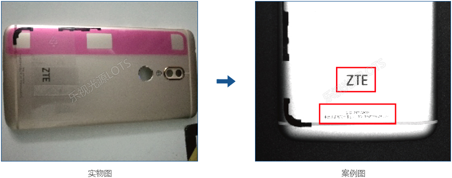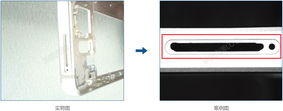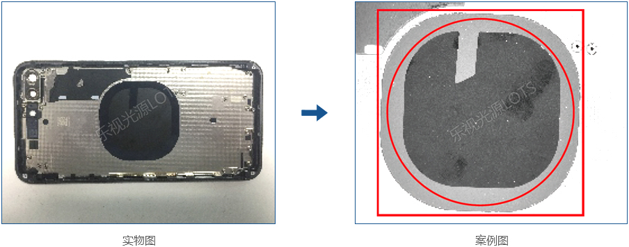 手機(jī)邊殼帶點(diǎn)曲面,使用方形無(wú)影光源向邊殼各個(gè)方向均勻照射,邊緣輪 廓明顯,達(dá)到檢測(cè)目的。