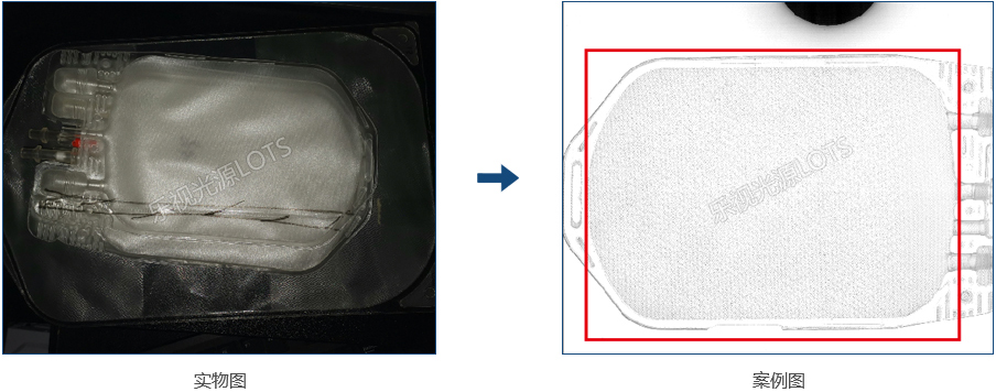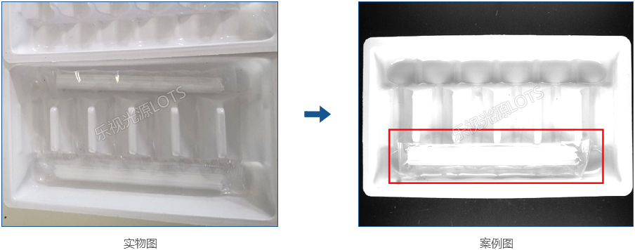 使用紅外背光源打穿產(chǎn)品,由于輸液軟管與需插入硬管材質(zhì)不同,兩者呈現(xiàn)不同灰度,實(shí)現(xiàn)檢測(cè)目的。