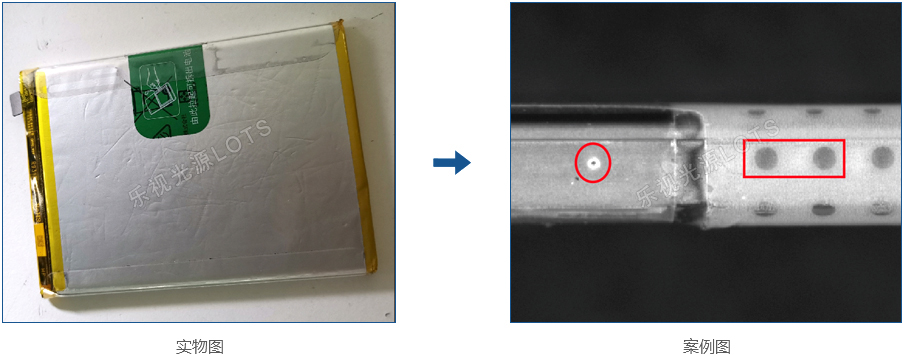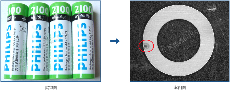 使用條形光兩側對打,絲印為黑電池底面為白,低工作距離減少電池表面 反光的同時打亮小孔。