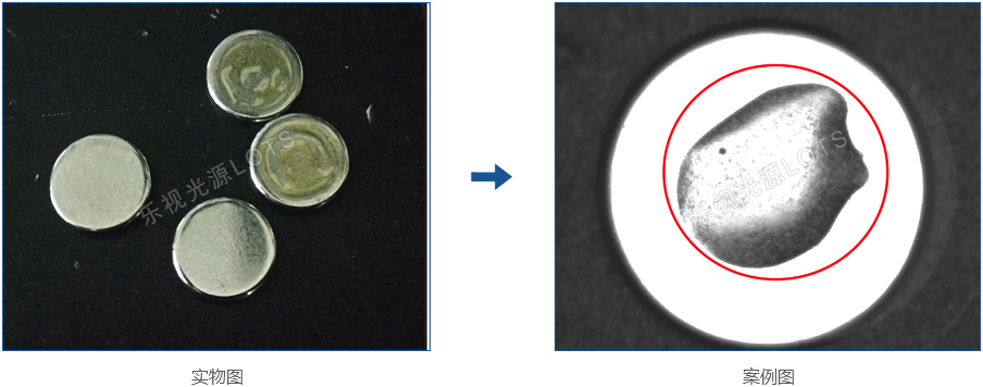 采用低角度紫外環形光,低角度使底面金屬反光較少,使得膠水與背景形成 對比度。